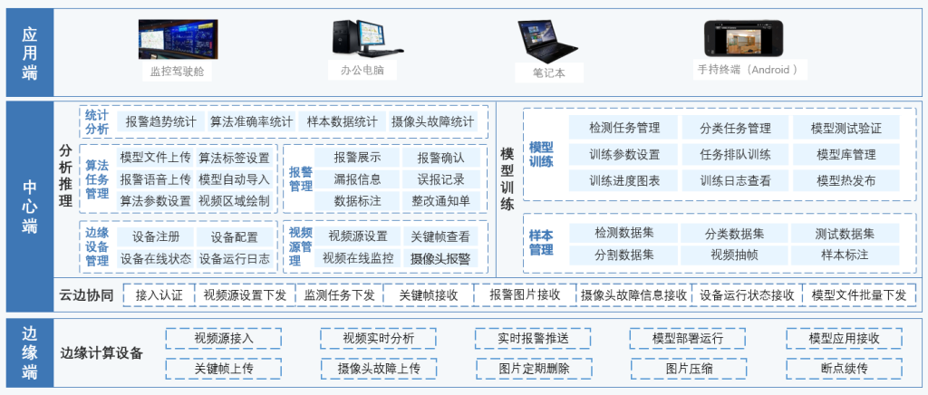 分为边缘端(边缘计算设备)、中心端(在线系统)和应用端(大屏、Web、移动应用)三部分。